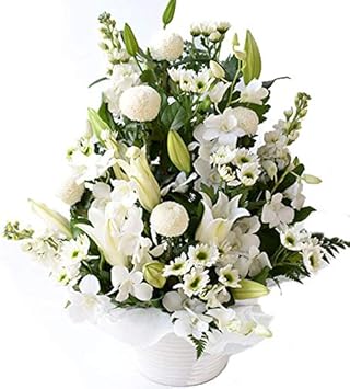Amazon Co Jp お供え お盆 初盆 お彼岸 秋 彼岸フラワーアレンジメント お悔み 白い百合のアレンジ 画像配信サービス付き 9 13 21発送は不可 ホーム キッチン